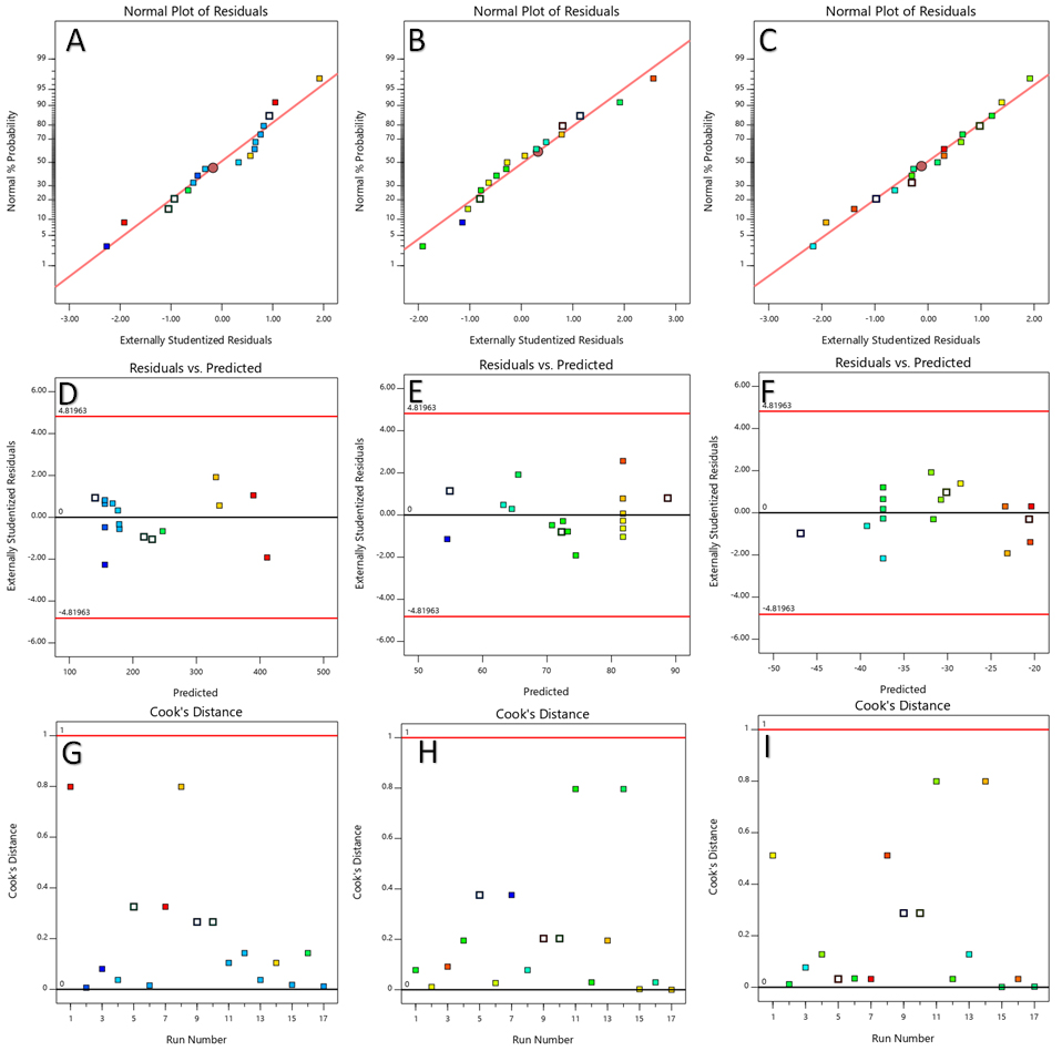 The contour plots for responses in fig. 9A (VS), 9B (EE), and 9C (ZP) depict the relationship between the independent variables and the corresponding response variables. These plots illustrate how changes in the levels of the independent variables affect the values of the response variables, providing insights into the optimal conditions for achieving desired outcomes. Additionally, the 3D plots for responses in fig. 9D (VS), 9E (EE), and 9F (ZP) offer a visual representation of the interaction between multiple IVs and their impact on the response variables [68]. These plots enable a more comprehensive understanding of the relationships between the variables, facilitating the identification of optimal parameter settings for maximizing VS, EE, and ZP.
