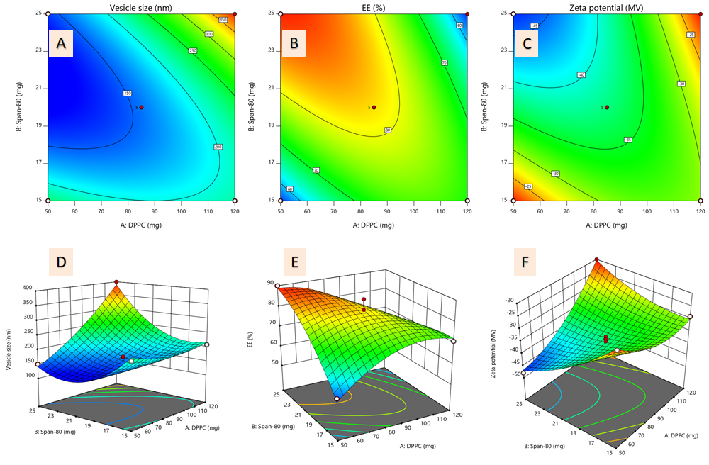 Fig. 9: Contour plots for the responses: A) Vesicular size, B) Entrapment efficiency, and C) Zeta potential. 3D plots for the responses: D) Vesicular size, E) Entrapment efficiency, and F) Zeta potential