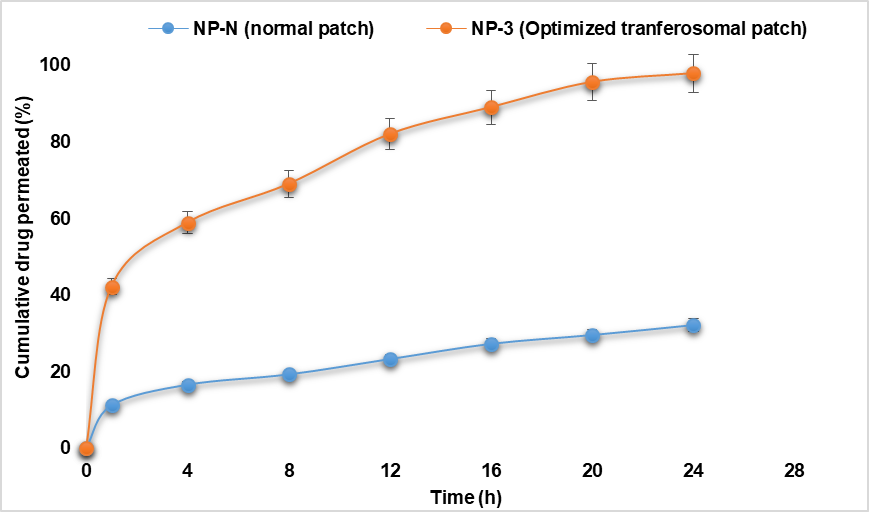 Fig. 10: Comparision of optimized transferosomal patch (NP-3) with the normal patch; values are given in mean±SD; n=3. Error bars indicate SD