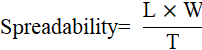 Spreadability of gels was measured by using wooden block apparatus, on the wooden base, one glass slide was stuck and another glass slide was attached to the pulley, of which another end has weighed pan. The 2 gm of gel pressed between 2 slides for uniform thickness. The 100 gm of weight was removed, and times (seconds) require by movable slide getting separated from stationary slide were noted [30]. Spreadability was calculated as: