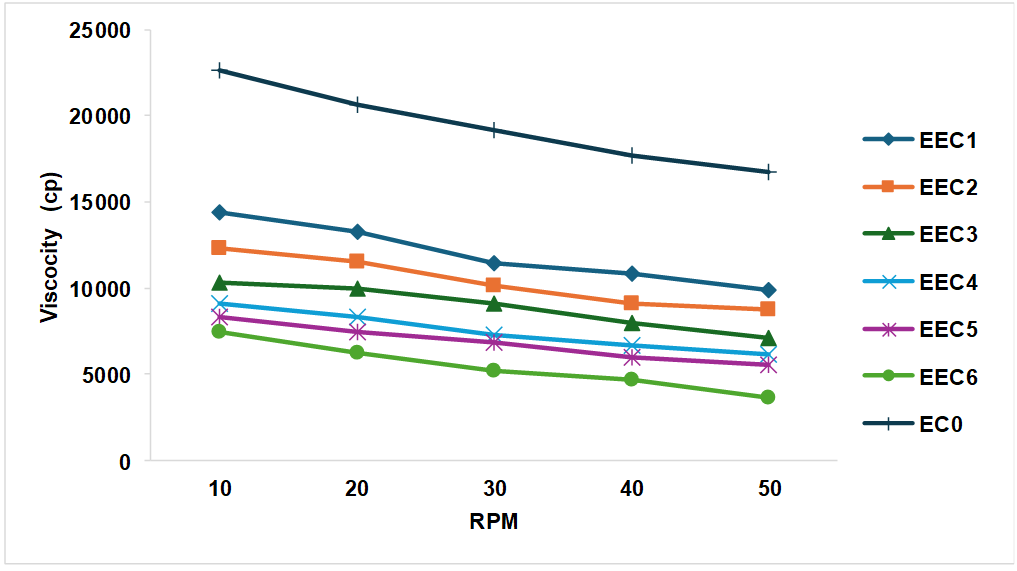 For viscosity determination a Brookfield viscometer LV DV-II+PRO model was used. T-95 Bar spindle was used and whole study done at room temperature. 50 g of each ethosomes sample was taken in was dipped. The Readings for viscosity were taken at 10, 20, 30, 40, 50 rpm at room temperature. Spindle was rotated for 5 minute for every reading. Evaluations were done in triplicates, and mean±SD viscosities were calculated [32].