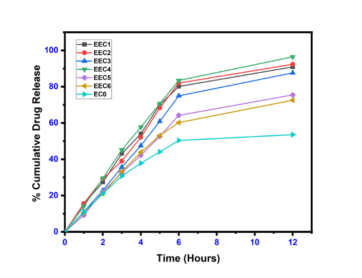 The pH of the developed gels (EEC1-EEC6 and EC0) was determined in triplicate with pH meter (pH Cal Model). 1 gm gel was dissolved in 100 ml water after 2 h pH was measured [31]. Average pH is reported in table 6.