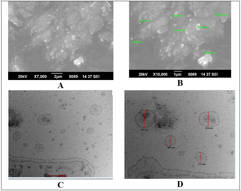 Fig. 7: SEM (A and B) and TEM (C and D) images of optimized ethosomes