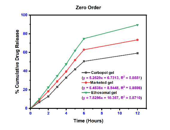 A soaked cellophane membrane was placed between donor and receptor compartments of the Franz diffusion cell. Ethosomal gel was applied to the cellophane membrane and phosphate buffer was kept in receiver compartment and it stirred continuously with a magnetic bar at 50 rpm. 1 ml sample was taken at 0, 1, 2, 3, 4, 5, 6, and 12 h intervals, volume of receiver compartment replaced with 1 ml of buffer solution, and the sample was analysed by using Ultra-Violetviolet (UV) spectrophotometer at 281 nm. The percentage of drug released was then calculated [34].