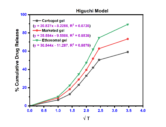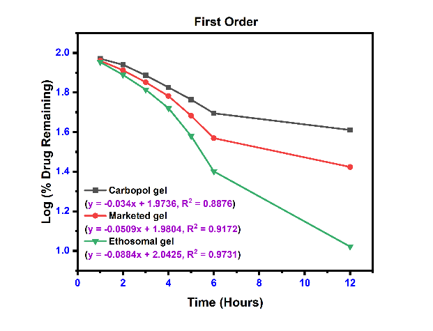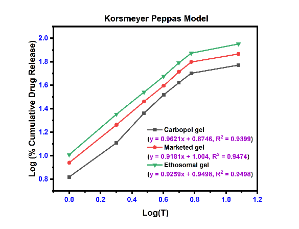 The linear curves and their corresponding equations for kinetics models with correlation coefficient (r2) for etodolac Carbopol gel, Marketed gel and Ethosomal gel using different kinetics are shown in fig. 8 and table 8. The r2 values were found higher for the first-order model and Korsmeyer-Peppas model for all formulations. The release profile of with Korsmeyer-Peppas equation revealed the value of “n” predicts the mechanism of the drug release. If "n" value<0.45 indicates Fickian diffusion, 0.45 to 0.89 denotes non-Fickian transport, n = 0.89 suggests Case II transport, and n>0.89 indicates super Case II transport for a cylindrical system [50]. Super Case-II transport is associated with stresses and transition present in hydrophilic glassy polymers which swell in presence of water or different biological fluids. These three formulations are shown value>0.89, it means a release is super Case II transport [51].