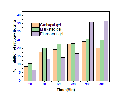 Anti-inflammatory study of optimised ethosomal gel (EEC4) formulations was evaluated inducing carrageenan into hind paw of rats with permission of ethical committee (Biotox/IAEC/03/2024/RP-14). For this, 24 rats were divided into four groups. Each group had 6 rats. Formulations were topically applied 20 mg/kg of dose to the surface of the left hind paw of the rats and gently massaged before 30 min of intraplanar injection of 100 µl** of carrageenan solution (1% w/v) into the left hind paw. The digital vernier calliper was used to measure the difference in volume between the right and left paws (Baker, DDS Series) at ½, 1, 2, 4, 6, and 8 h after the carrageenan injection. The percentage inhibition of edema was calculated by using the following formula,