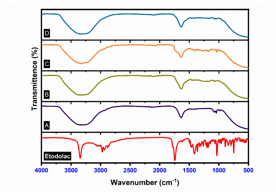 Fig. 11: FTIR spectra of etodolac; A: Etodolac transferosome, B: Plain carbopol gel, C: Etodolac carbopol gel, D: Etodolac ethosomal gel