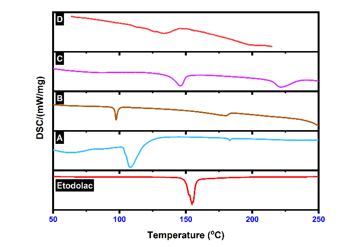 Fig. 12: DSC graph of etodolac; A: Etodolac transferosome, B: Plain carbopol gel, C: Etodolac carbopol gel, D: Etodolac ethosomal gel