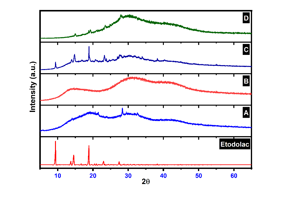 XRD for Etodolac, drug-free Carbopol gel, etodolac Carbopol gel, optimized etodolac ethosomes and optimized etodolac ethosomal Carbopol gel were analysed using X-ray diffractometer (Bruker D8 Advance, SAIF, Cochin, India) [44].