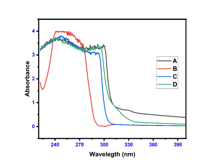 Fig. 14: Maximum absorption spectra of etodolac; A: Etodolac transfer some, B: Plain carbopol gel, C: Etodolac carbopol gel, D: Etodolac ethosomal gel