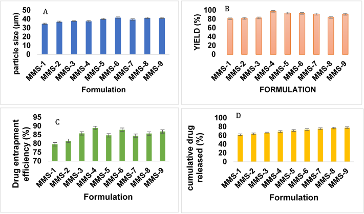 The production yield (Y) of the microspheres was assessed by dividing the average weight of microspheres recovered from each of the three trials (W1) by the total weight of the initial dry material used (W2), and then multiplying by 100 to express it as a percentage. This scheming provided insight into the efficiency of the microsphere production process, reflecting how much of the initial material was positively converted into microspheres [18]. The resulting yield percentage helped assess the effectiveness and reproducibility of the manufacturing process, crucial for scaling up production and ensuring consistent quality of the microsphere formulations (e. q.1).