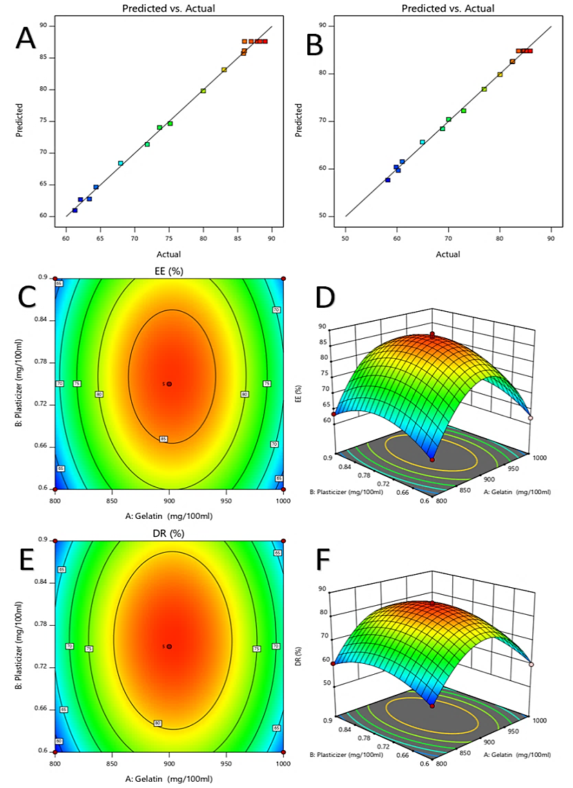 The data were collected and assessed using GraphPad Prism (v. 8.0; San Diego, California, USA), Design Expert version 11 software, and Microsoft Excel 2016. Expressive statistics, including mean±standard deviation, were utilized to summarize the data. Analysis of Variance (ANOVA) was employed to govern variances amid sets, with a significance level established at (P<0.05) to designate statistically significant variations. This comprehensive statistical analysis was conducted to offer robust insights into the experimental data and to assess the significance of observed trends and differences within the study.