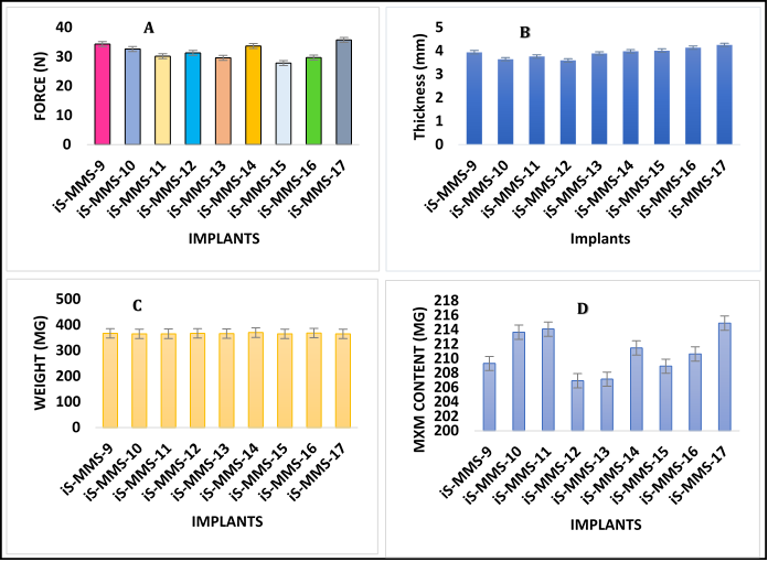 Uniform weight is important for dosing accuracy and patient safety. Consistency in weight ensures that each implant contains the intended amount of MXM, suppressing the risk of under- or overdosing. This uniformity is especially critical in controlled expulsion systems where precise drug concentrations are required to maintain therapeutic efficacy over an extended period. Lastly, uniformity in MXM content directly influences the drug's pharmacological effect. Variations in drug content among implants could result in inconsistent therapeutic outcomes, compromising patient treatment. Ensuring uniform MXM content guarantees reliable and predictable drug expulsion, enhancing the reproducibility and effectiveness of the implant. Gobin et al. (2006) tested the mechanical assets of silk fibroin and chitosan mixture scaffolds and observed uniformity in the physical constraints [71].