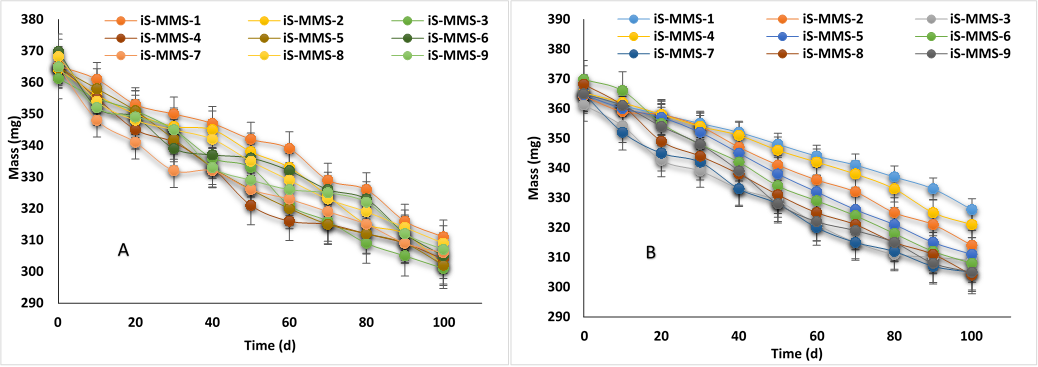 The DSC analysis confirmed the sharp melting behavior of MXM and revealed a homogeneous distribution of all formulation components within the implant structure. FTIR analysis suggests that MXM and S-MMSs can coexist harmoniously within the formulation, enhancing its potential as an effective drug delivery system. The versatility of MMSs in offering a customizable PS range is pivotal for tailoring drug delivery systems to specific therapeutic needs, from rapid expulsion to targeted delivery.