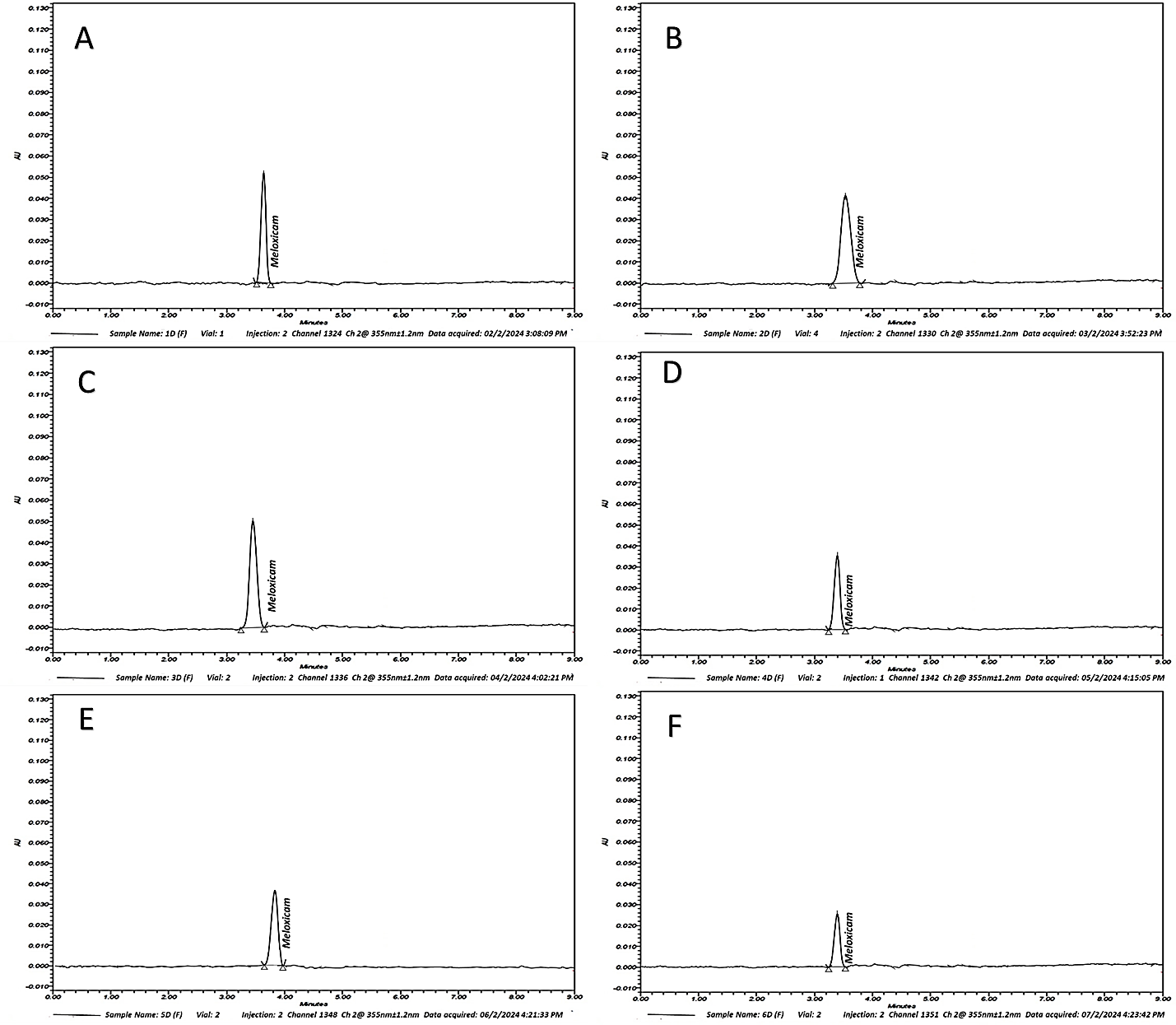 Fig. 10: The graph of the plasma sample with iS-MMS-17 implants indicating its availability in the blood plasma on A) after day 1; B) after day 2; C) after day 3; D) after day 4; E) after day 5; F) after day 6