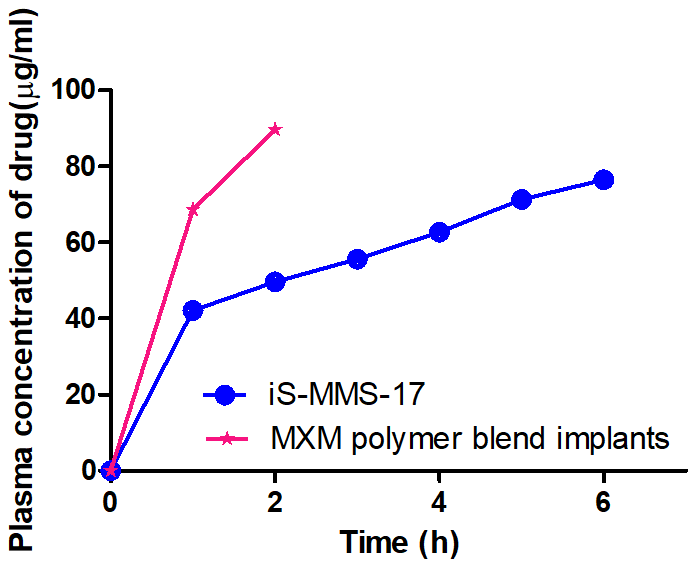 Fig. 11: Mean plasma levels of iS-MMS-17 vs. MXM polymer blend implant (n=3)