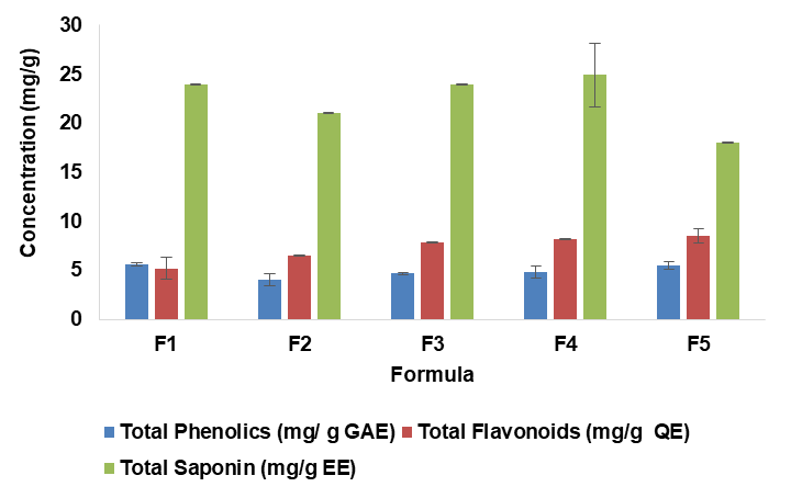 It can be seen from fig. 1 that the phytochemical contents obtained are significantly different due to the influence of different concentrations of ingredients in the five formulas. The concentration levels of phytochemical compounds contained in the optimal formula (F5) showed high total phenolics (5.517±0.382 mg/g GAE) and total flavonoids (8.501±0.695 mg/g QE). Meanwhile, the total saponins showed the lowest value (17.991±0.052 mg/g EE). Therefore, it can be assumed that the SNEDDS formulation had an influence on the chemical compositions of the formula, and the optimal formula (F5) was characterized by a high concentration of phenolics and flavonoid compounds but a low saponin concentration.