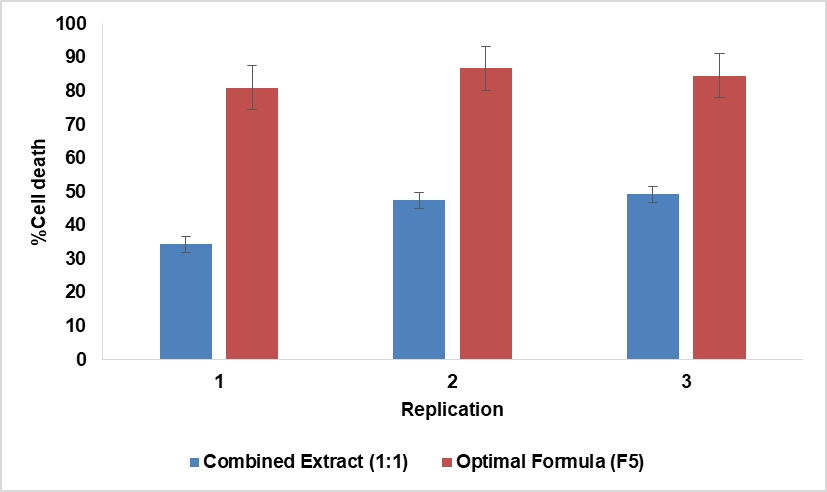 Fig. 2: Percentage of cell death of combined extract (1:1) and optimal formula (F5). Data were presented as mean±SD, n=3