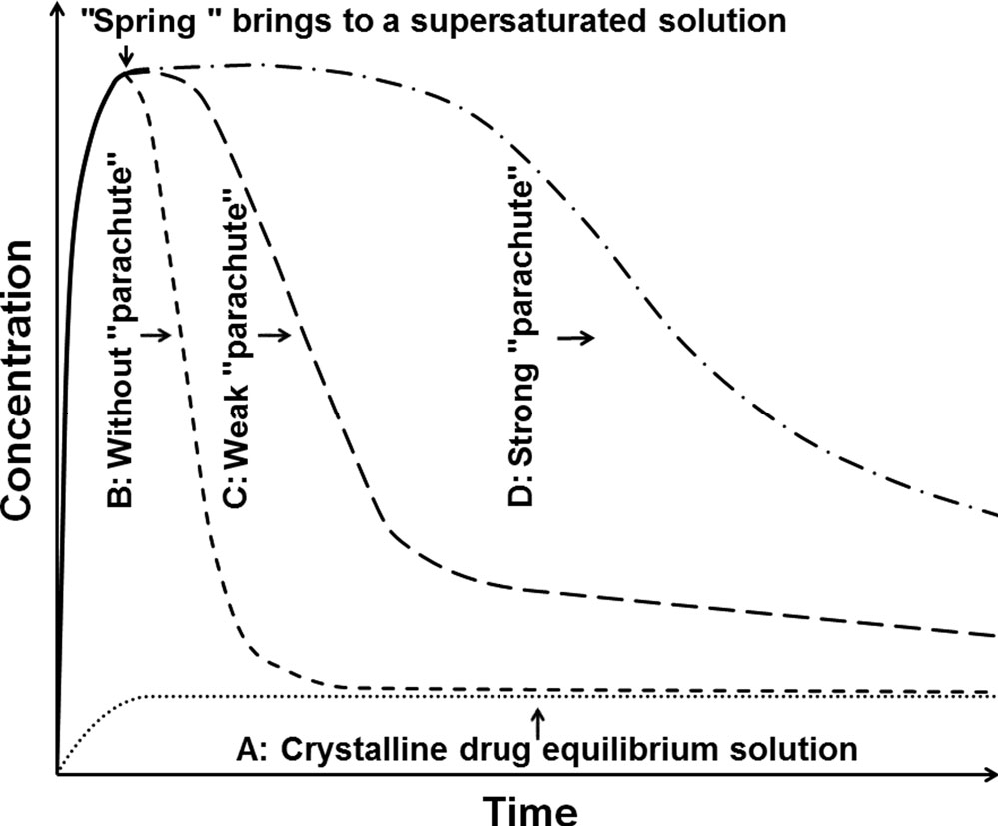 The pH dependent polymers like Hydroxypropyl Methylcellulose Acetate Succinate (HPMC-AS), eudragit-L100 as polymeric carriers and non-ionic surfactants/solubilizers like poloxamers P188, polysorbate 80, vitamin E TPGS have been reported to enhance drug solubilization, dissolution and in vivo permeability of BCS-II and IV drugs formulated as solid dispersions [4]. Such ternary amorphous solid dispersions have been postulated to enhance dissolution and in vivo permeability by below mechanisms which was introduced and explained by Guzman H et al. [4, 5]. A theoretical ‘Spring-parachute model’ is presented in fig. 1 to demonstrate various solubility enhancement scenarios [6, 7, 23].