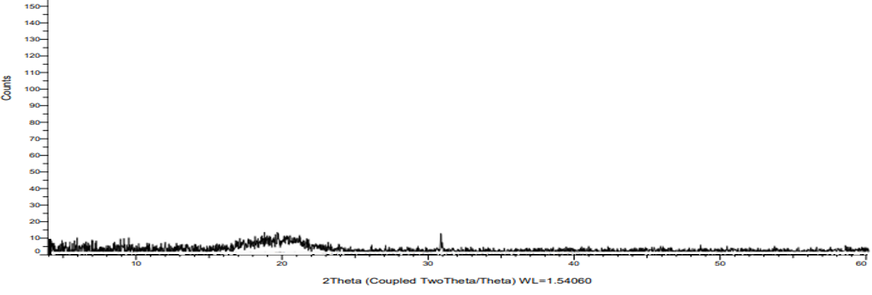 The P-XRD pattern of pure crystalline ticagrelor and its amorphous solid dispersion prepared with HPMC-AS are shown in fig. 5 and 6 respectively. Pure ticagrelor has shown sharp crystalline peaks of 2θ at 13.4°, 18.2°, 22.5° and 24.2°, whereas all the crystalline peaks were not observed in the solid dispersion sample, which indicates complete conversion of the input crystalline ticagrelor into an amorphous form. The comparative P-XRD pattern for crystalline pure ticagrelor and its amorphized solid dispersion samples has been discussed by Panda R et al. using solvent evaporation technique [12].