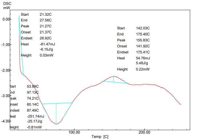 The DSC thermograms of pure ticagrelor and ticagrelor solid dispersion are presented in fig. 7 and 8. The melting and crystallization temperatures of ticagrelor API are indicated by the endothermic peak at 139.77 °C. However, glass transition temperature (Tg) of the ticagrelor solid dispersion sample indicated by the endothermic peak at 74.21 °C confirming amorphous conversion of ticagrelor [12, 17].