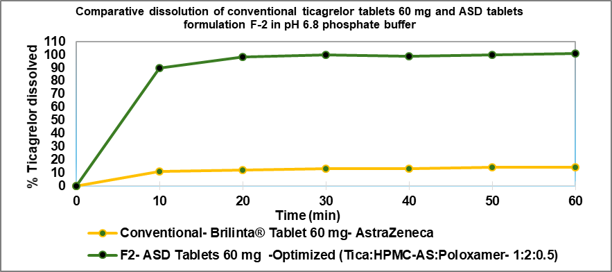 The input crystalline ticagrelor found to be completely amorphized, as confirmed by the P-XRD and DSC results of API and amorphous solid dispersion formulation prepared by HME technique. A significant increase in the solubility of ticagrelor from ASD sample was achieved compared to pure crystalline drug. An ~8 fold increase in ticagrelor dissolution was achieved from optimized ternary ASD tablets compared to marketed conventional Brilinta® (ticagrelor) tablets 60 mg. The significant enhancement in solubility and dissolution rate can be attributed to mechanisms like amorphization of crystalline drug and improvement in the wettability of the hydrophobic ticagrelor particle by surfactant poloxamer 188 and molecular stabilization of amorphized ticagrelor with polymeric carrier HPMC-AS.
