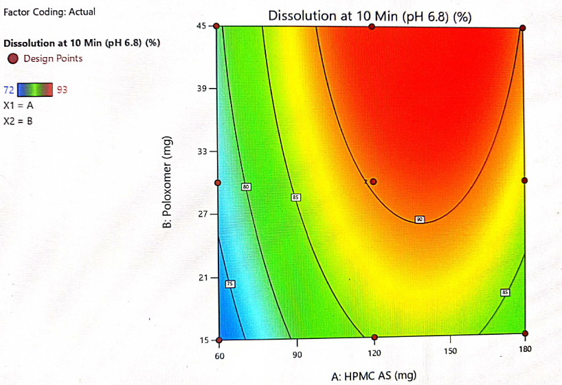 Fig. 10: Contour plot showing the interaction of HPMC-AS and poloxamer and their impact on dissolution at 10 min