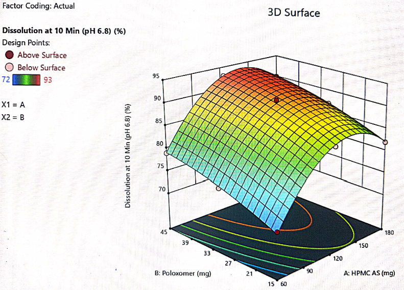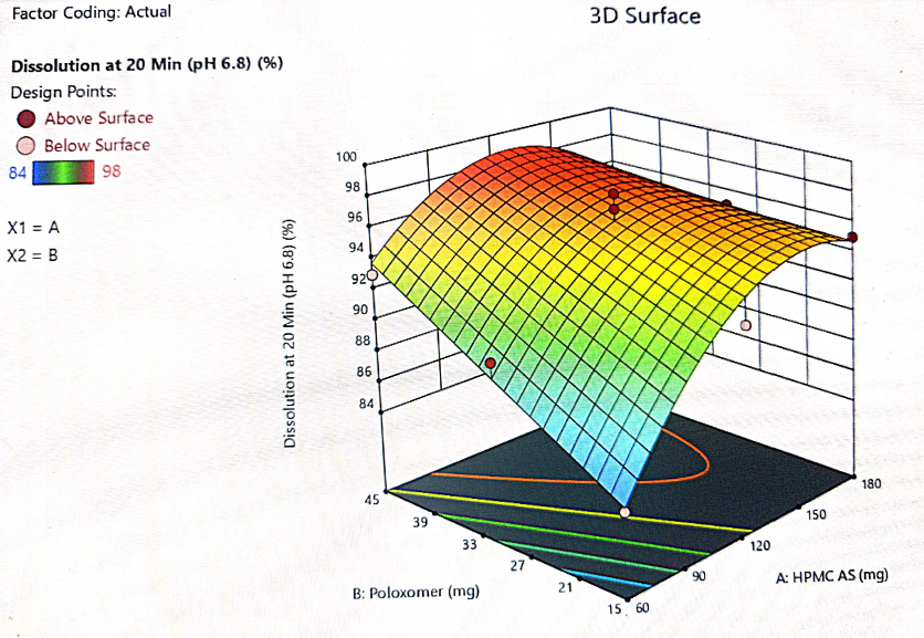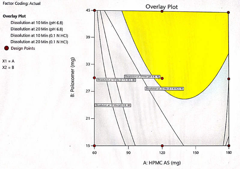 The optimization of the critical factors and design space evaluation of the responses Y1: dissolution at 10 min and Y2: dissolution at 20 min is presented in table 11 and overlay plot as fig. 16. The model was found to be significant for both the responses based on p-values less than 0.050 and the insignificant lack of fit p-values 0.8249 and 0.3470 i. e. more than 0.050 (table 8). The impact of the level of both HPMC-AS and poloxamer on dissolution at 10 min was found to be significant and an interaction is represented by a non-linear response, as presented in 3D plots (fig. 11 and 14).
