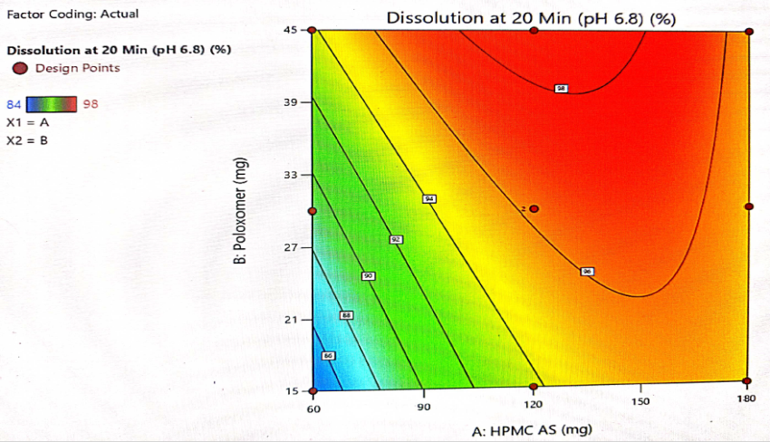 Fig. 13: Contour plot for interaction of HPMC-AS and poloxamer and its impact on dissolution at 20 min
