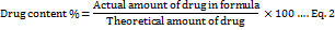 Drug content was determined for all the prepared solid dispersion formulations by dissolving an exactly weighed amount of isradipine solid dispersion equivalent to 5 mg in 50 ml of ethanol using 50 ml volumetric flask; then, the solution was evaluated for drug content using a UV-spectrophotometer at its specified λmax (326 nm) after being appropriately diluted with ethanol. The formula below was applied to calculate the percentage of drug content [12].