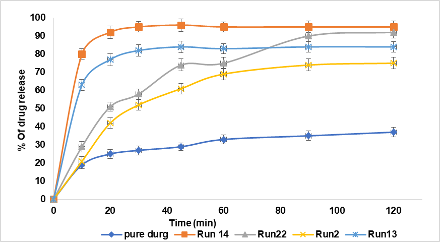 Pure isradipine and prepared solid dispersion formulas have been evaluated for in vitro dissolution using a USP apparatus II (Erweka DT720 GmbH, Germany). An equivalent amount of 5 mg of the drug was dispersed in 500 ml of pH 6.8 phosphate buffer. A thermostatic water bath was used to maintain the temperature at 37±0.5 °C. The device was set up to revolve at a rate of 75 revolutions per minute [14]. This evaluation was performed in triplicate on the prepared formulations that showed the highest solubility (run 2,13,14 and 22) when compared to the pure drug. A sample of 10 ml was collected from the dissolution medium at specific intervals of 10, 20, 30, 45, 60, 90, and 120 min and replaced with a fresh dissolution medium. After filtration, each sample was filtered using a 0.45-micron syringe filter, and the amount of dissolved isradipine was measured using a spectrophotometer at the drug
