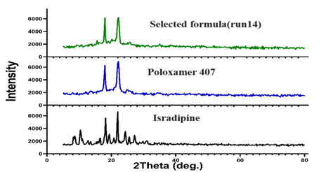The XRD pattern of the pure drug, PXM 407 and the selected formula (run 14) are shown in fig. 5. Pure-drug exhibited a high-intensity diffraction angle at 8.5º, 10.4°, 12.7º, 16.5º, 18.17º, 19.3º, 21.9º, 24.3º and 27.2º, indicating typical crystalline pattern. These results approached the previously documented data [27]. The XRD diffractogram of the selected formula showed a significant decrease or complete absence of the characteristic isradipine peaks. This indicates that either the prepared solid dispersion is mainly composed of an amorphous state or the drug is completely dispersed through the polymer [28].