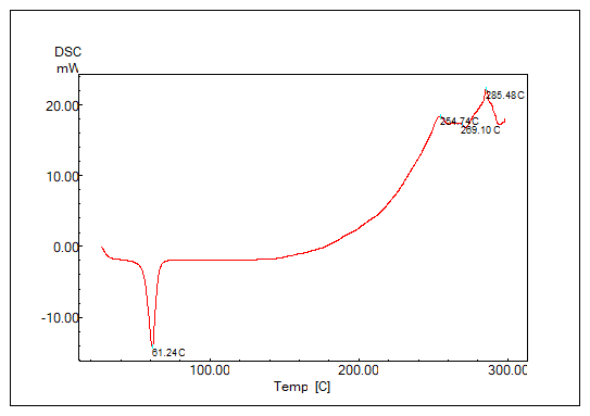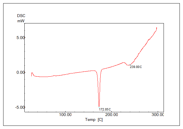 The thermal behavior of pure isradipine, PXM 407, and the selected formula were evaluated using DSC (Shimadzu, Japan). A closed aluminum pan containing ten milligrams of each sample was heated at 10 °C per minute over a temperature range of 10 °C to 300 °C [18].