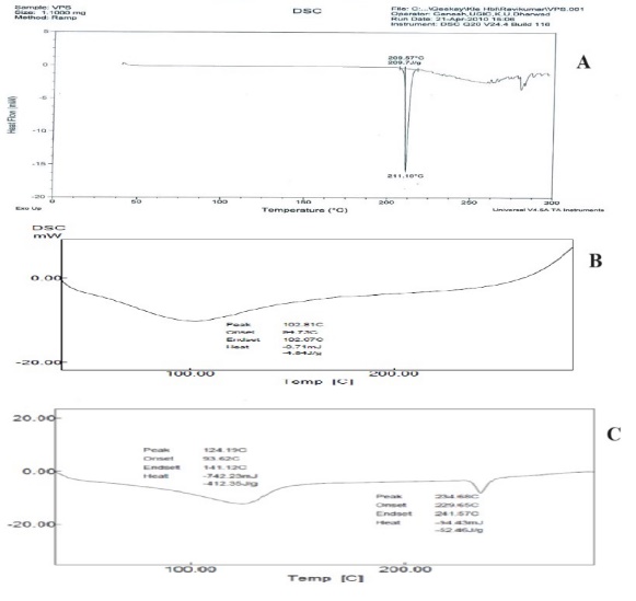 Fig. 3: DSC thermo g of pure venlafaxine (A), Placebo (B) and DGSZ2 formulation (C)