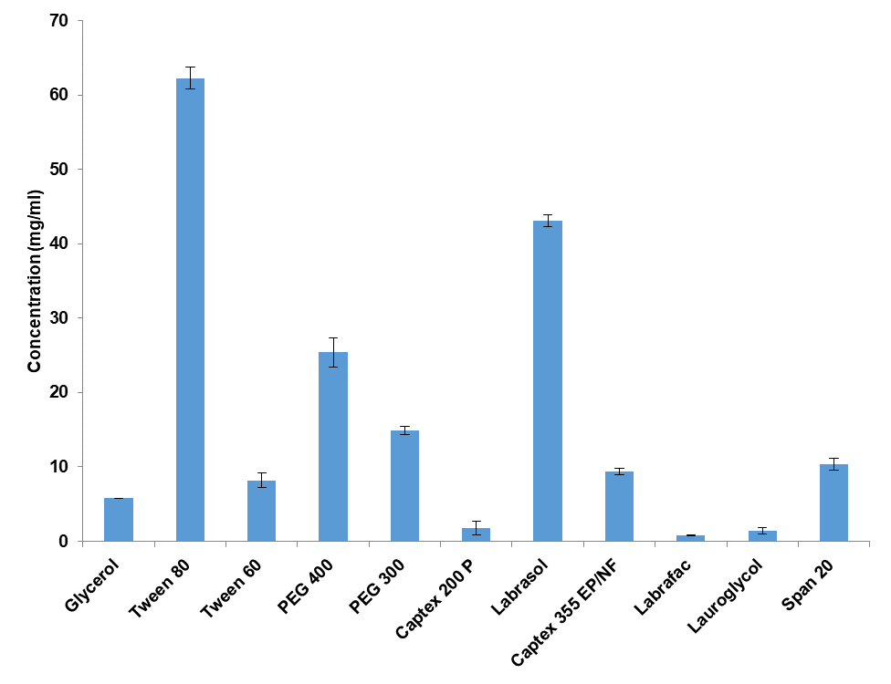 Fig. 1: Saturation solubility of cinacalcet HCl in non-volatile solvents. Data expresses as mean±SD, n = 6