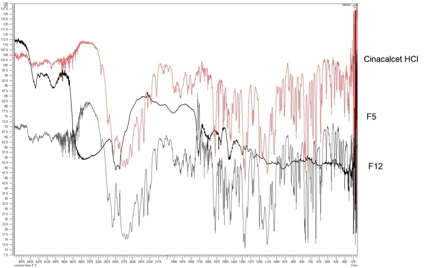 Fig. 3: FT-IR study for cinacalcet HCl, F5 and F12