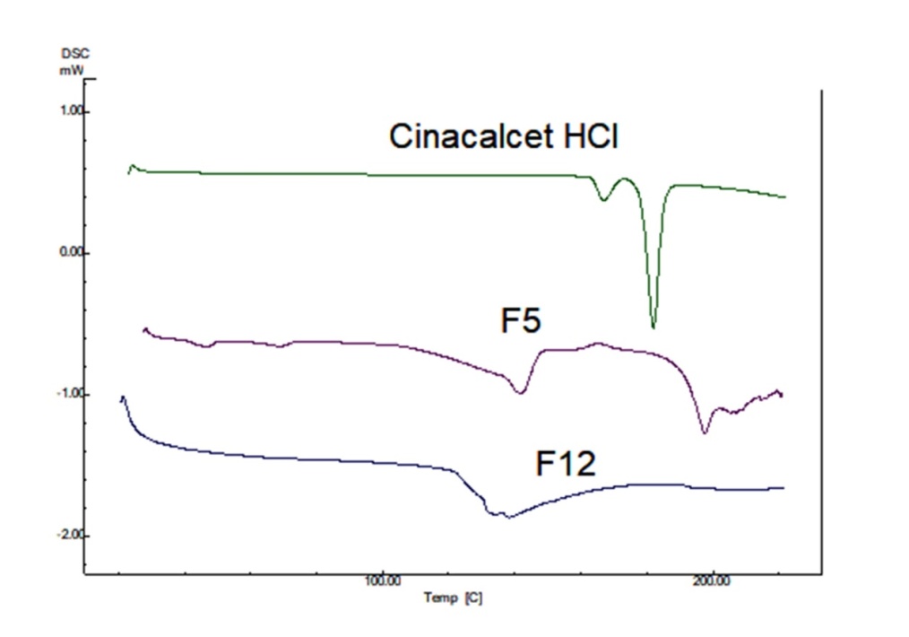 Accurately weighed samples of cinacalcet HCl, F5, and F12 were enclosed in sealed aluminum pans and subjected to thermal analysis. (Heating rate 10 °C/min from ambient temperature to 220 °C).