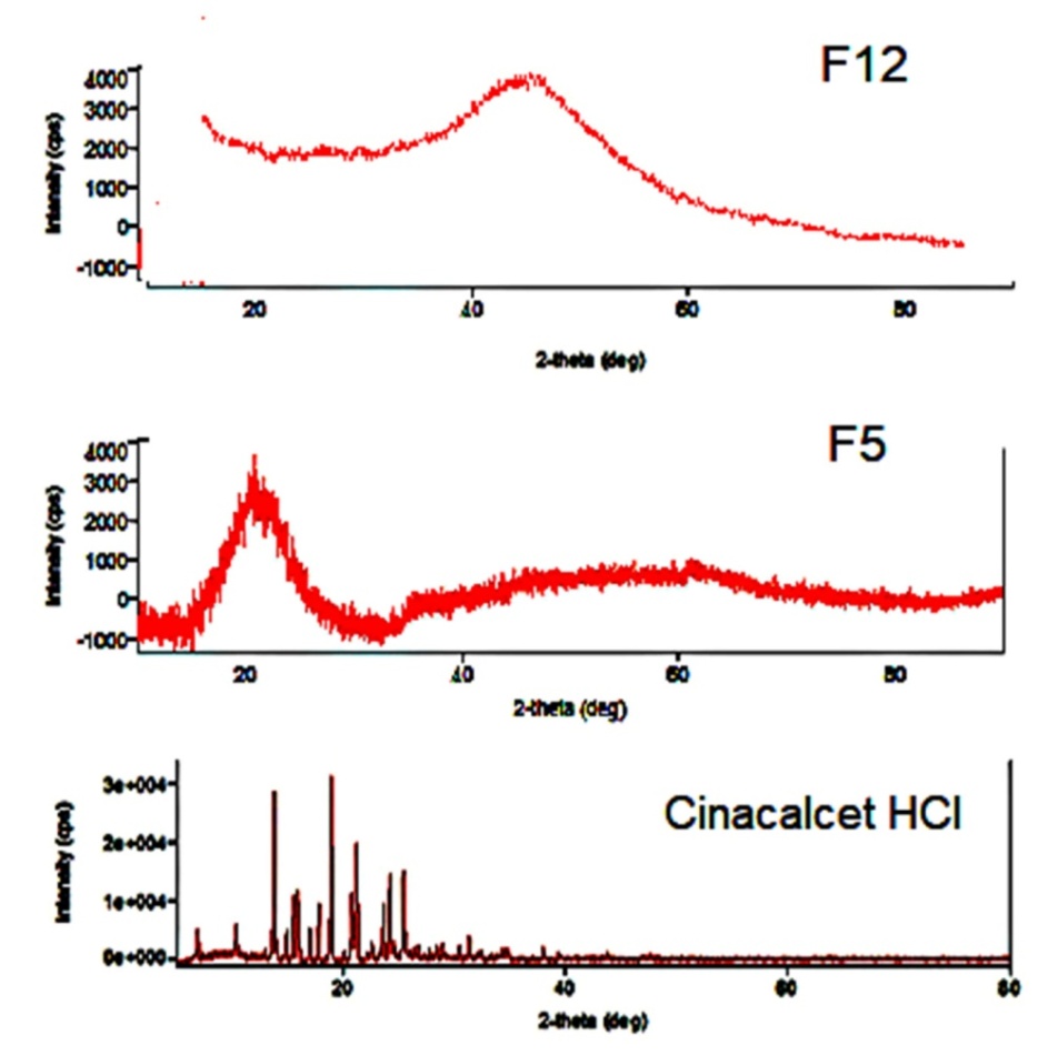 Powder X-ray diffraction patterns were obtained for both pure cinacalcet HCl and liquisolid tablets (F5 and F12) within the 2 to 70° 2θ angular range.