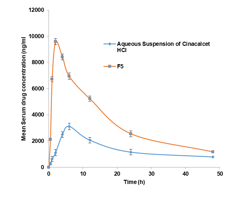 The pharmacokinetic study findings (table 8 and fig. 6) for aqueous suspension of cinacalcet HCl and liquisolid tablet (F5) suggest that tween 80-based liquisolid tablet (F5) exhibited faster dissolution and rapid absorption as ascertained from the decreased Tmax from 6 to 2 h. The intensity of action for the liquisolid tablet (F5) was nearly 3 times more as evidenced by Cmax values. The AUC (area under the curve) values are higher for liquisolid tablets which suggests that oral bioavailability was increased by 2.5 fold [34].