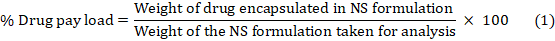 Encapsulation Efficiency (EE) is the ratio of drug weight entrapped in a carrier system to drug added. Drug loading is drug weight/carrier system weight [27]. PONS complex was added in methanol, sonicated for 10 min to breakdown it, diluted, and examined by UV spectrophotometer at 263.12 nm to know its concentration. The "percent drug pay load" and "percent drug EE" were computed using equations 1 and 2: