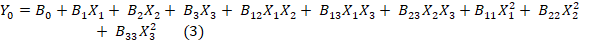 Y0 is the dependent variable, B0 is the intercept, B1, B2, and B3 are the regression coefficients calculated from Y's experimental values, and X1, X2, and X3 are the coded independent variables. The interaction terms are X1X2, X1X3, and X2X3, whereas the quadratic terms are X12X22X32.