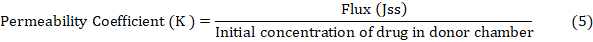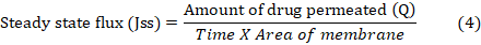 Ibrahim et al. [29] conducted an ex-vivo permeation research on male wistar rats. A diffusion cell with the stratum corneum facing up held the rat skin among the donor and receptor compartments. The receptor compartment received 30% (v/v) ethanol in phosphate buffer pH 7.4 to keep sink conditions. The temperature was kept at 37±1 °C. NS PO (10 mg) was applied to rat skin. Magnetic beads swirled receptor compartment content. Samples were taken at various times and replaced with fresh medium. Drug content was measured by means of a 263.12 nm UV spectrophotometer. The cumulative drug permeation (Q) at varied time intervals and steady state flux (Jss), permeability coefficient (Kp), and enhancement ratio (ER) were estimated using the subsequent equations: