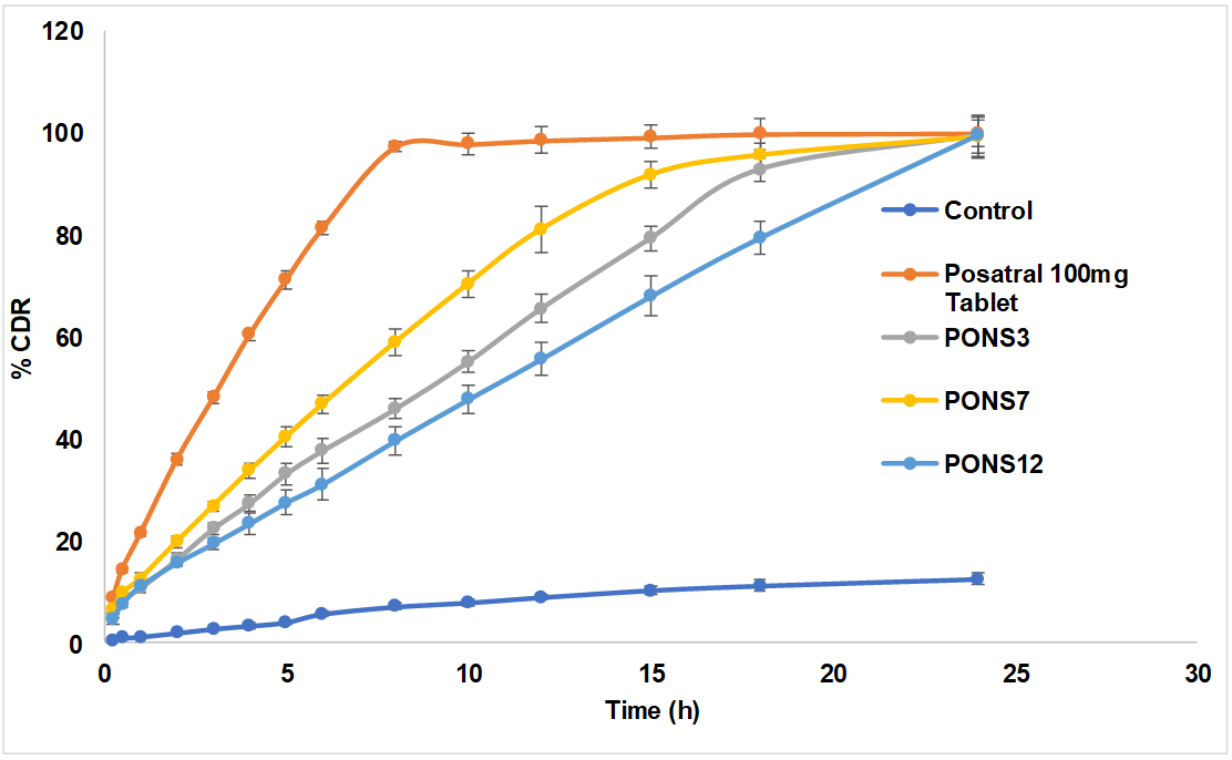 The in vitro release investigation used multi-compartment (n=6) rotating cells with a dialysis membrane. The donor phase comprised of a 5 mg Drug in 100 ml simulated gastric fluid (pH 6.4). The receptor phase has the similar media. The receptor phase was supplemented with 0.5% w/v sodium lauryl sulphate (1 ml) to keep sink conditions. The receptor phase was entirely removed after fixed time breaks, diluted with distilled water, and analysed by UV spectrophotometer. The trial was tripled.