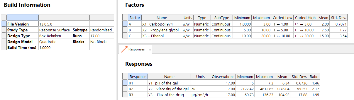 Using Design Expert®, second-order polynomial models and quadratic response surfaces were used to optimize the formulations in a 3-factor, 3-level BBD. Table 1 lists the independent and dependent variables with their low, medium, and high coded values. Experimental design yielded the polynomial equation: