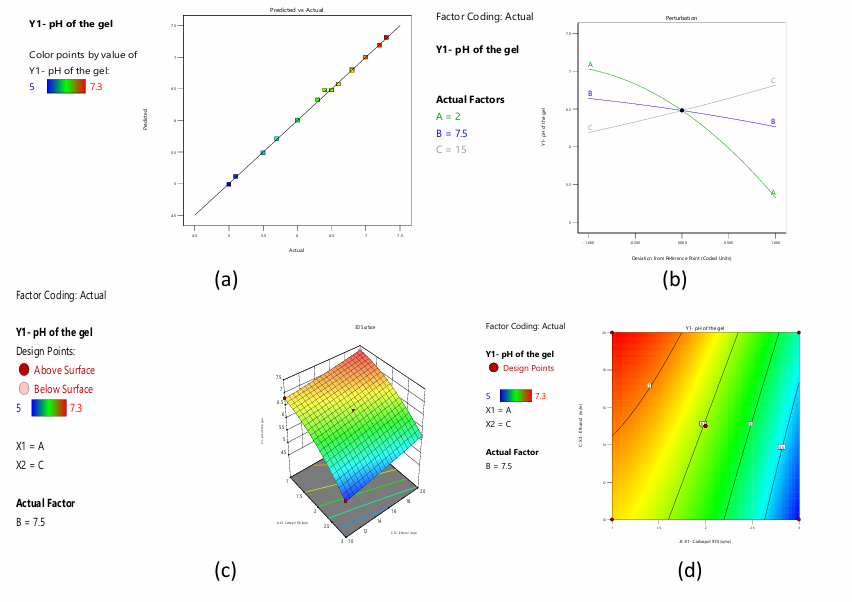 Fig. 6: a) Predicted versus actual values of the response pH of the gel b) Perturbation plot displaying the individual influence of variables on Y1 c) 3-D RSM and contour plot displaying the interactive influence of A and C on Y1