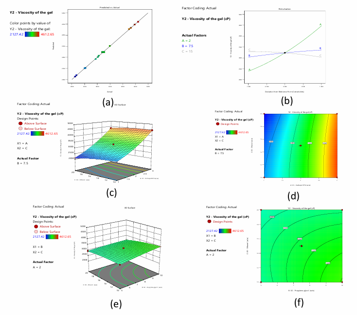 Fig. 7: a) Predicted versus actual values of the response viscosity of the gel b) Perturbation plot displaying the individual influence of variables on Y2 c) and d) 3-D RSM and contour plot displaying the interactive influence of A and C on Y2 e) and f) 3-D RSM and contour plot displaying the interactive influence of B and C on Y2
