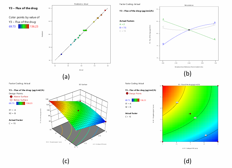 Fig. 8: a) Predicted versus actual values of the response flux of the drug b) Perturbation plot displaying the individual influence of variables on Y3 c) and d) 3-D RSM and contour plot displaying the interactive influence of A and B on Y3