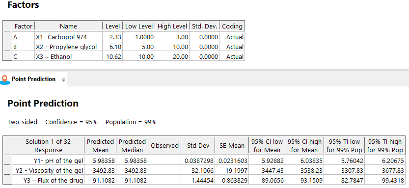 Optimisation of drug flow in topical gel formulation requires careful parameter modifications. Selecting a medicine with appropriate solubility and dissolution rate, fine-tuning polymer kinds and concentrations, adding surfactants or penetration enhancers, modifying pH, and carefully managing co-solvent concentrations are important. Temperature, gel microstructure, and storage conditions also matter. The formulation is refined using in vitro and in vivo testing and statistical optimisation methods like Design of Experiments [35]. The actual and projected drug flux (μg/cm2/h) values and residuals are compared. Various concentrations of carbopol 974 (Factor 1), propylene glycol (Factor 2), and ethanol are tested. Drug flux is the goal of the optimised formulation. The residuals show the difference between real and anticipated values, assessing predictive model accuracy.