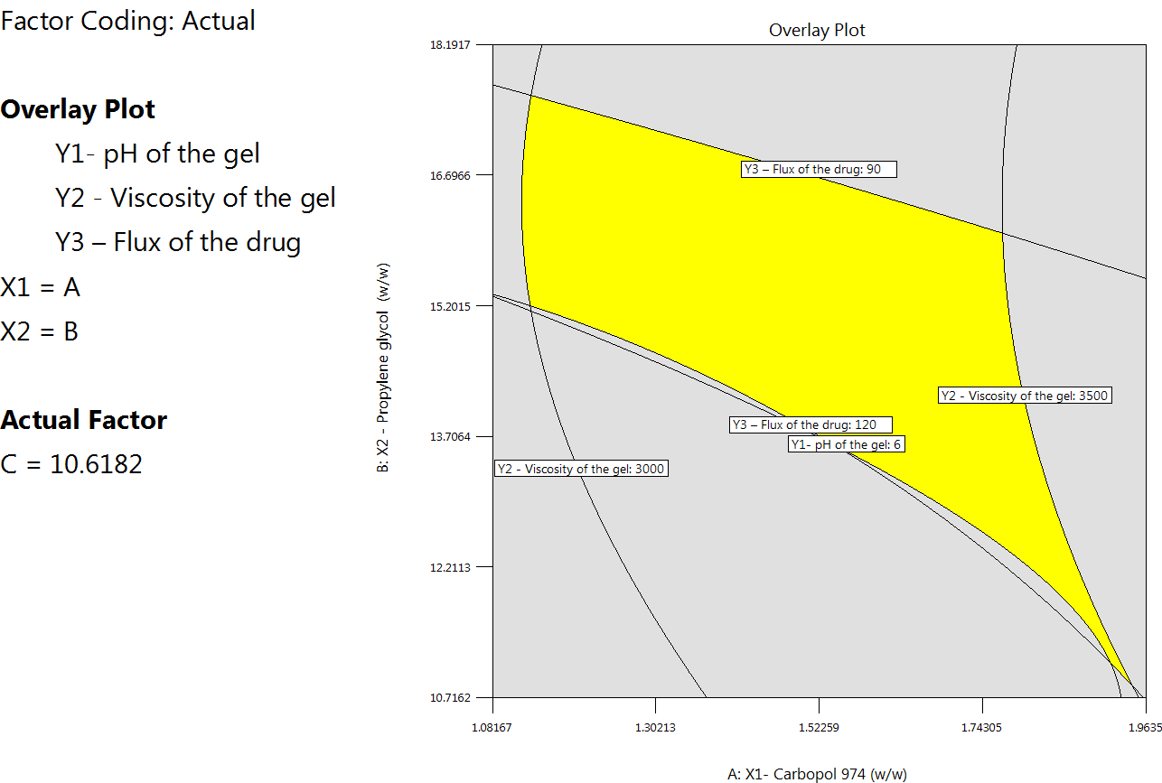 Numerical optimisation with desirable constraints determined the optimal levels of the critical process parameters (Carbopol 974 (A: X1), Propylene glycol (B: X2), and Ethanol (C: X3)) that affect gel pH (Y1), viscosity (Y2), and drug flux (Y3). Fig. 9 shows important variable optimums, projected quality attribute values, and reactions. The overlay plot in fig. 10 displays the design space for variables and responses for optimisation with desirability 1.000. To achieve reliable results, design-space plot chromatographic conditions were chosen as a control method. The procedure worked well with Carbopol 974 (2.327 w/w), Propylene glycol (6.096), and Ethanol (10.618).