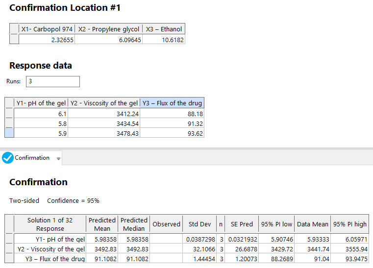 Three experiments at optimum critical variable levels (fig. 9) were used to prepare drug-loaded NS-based hydrogel formulations and determine their results. The critical method attributes' results were similar to the statistically predicted values (fig. 11).